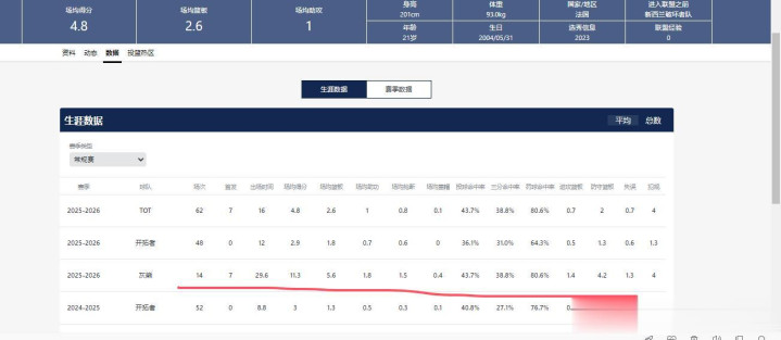 本赛季离开开拓者前,吕佩尔在队内的处境和杨瀚森一样,上场时间、战术地位寥寥无几,48次出场,场均只有2.9分1.8篮板。