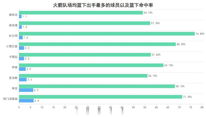阿门本赛季的篮下命中率高达71.3%,虽然命中率低于杜兰特但他场均篮下出手6.4次高居火箭全队第一,可以说他的篮下终结是火箭一个重要的进攻选择。