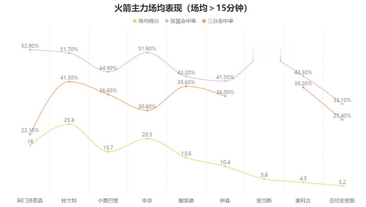 在火箭主力场均三分线外防守对手出手3次以上的球员中,阿门令对手命中率下降4.8%的幅度高居火箭7名外线主防者的第一高,这些可以表明虽然阿门有一定的短板,但他通过超长续航、有球无球冲击篮下与防守作用带给火箭各个方面的帮助,虽然他的数据一般但实则作用巨大。