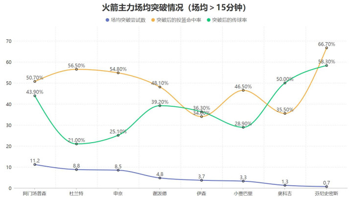 其二是阿门的冲击能力,火箭本赛季场均突破尝试次数最多的球员就是阿门的11.2次,虽然突破后的命中率不算全队最高但他同时有着43.9%的传球率,因此许多时候火箭的进攻发起就是依靠阿门的突破得分+分球,作为一支进攻选择不算多的球队他的存在给火箭更多战术发起的可能性。