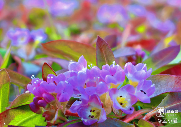 椭圆形的叶片不过指甲盖大,经霜的叶片墨绿中泛着酒红;哪怕被风沙磨出小缺口,依旧层层叠叠嵌作“酒红碎翠”。每株攒着三五簇绒球花团,直径不足一公分,凑近看是数十朵极小的五瓣花簇拥:粉紫花瓣薄如蝉翼,尖端晕着浅玫红,裹着芝麻大的赫红花蕊,风一吹便轻轻颤动,却不肯轻易凋零。