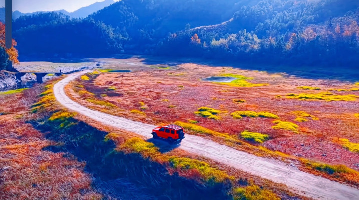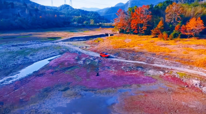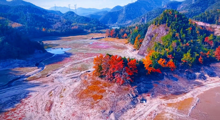 顺着指引往前走,跨过石板桥,终于在远处滩涂上瞥见一抹淡红——像块模糊的红云,晕在灰褐色的滩涂里。水库四周层林尽染,枫红与松绿交织,和滩涂的粉黛遥相呼应,恰似一幅色彩明艳的水墨画。