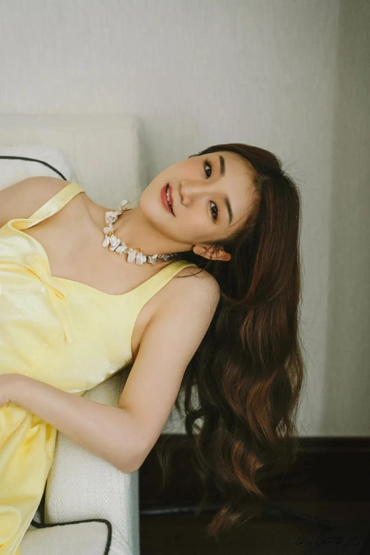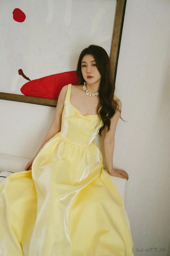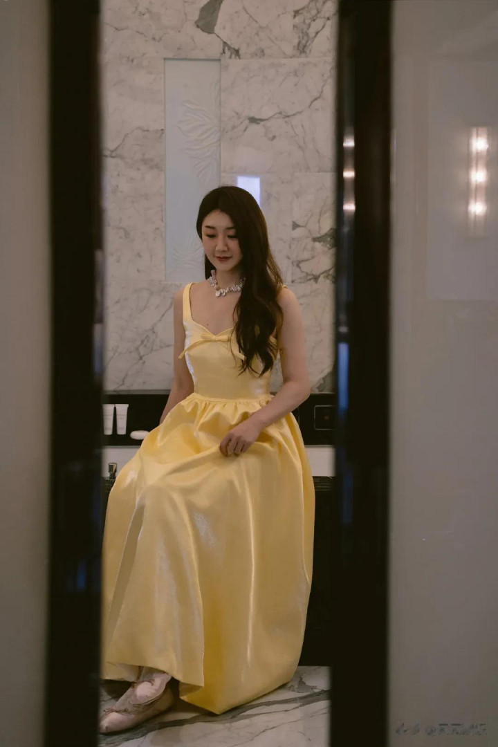 穿上这条黄色长裙的陈梦,真的给人一种公主即视感,仿佛是从童话世界里走出来的。她的头发披着,增添了一份慵懒和柔美。她的脸上化着淡淡的妆容,眼睛明亮而有神,嘴唇微微上扬,露出甜美的笑容,像公主一样!