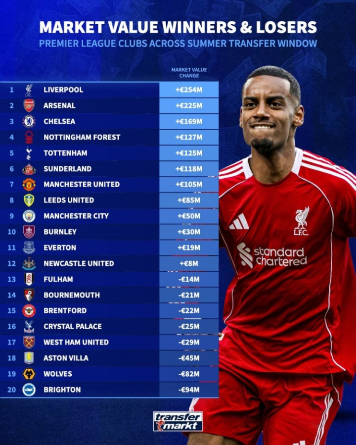 今年夏天,英超各俱乐部在单个转会窗口的转会费支出创下了纪录,高达35.9亿欧元。《转会市场》也统计了经过今夏(夏季转会窗口被定义为为6月1日至9月2日,其中包括世俱杯的临时转会窗口)的转会操作后各队的总身价变化情况,利物浦、阿森纳和切尔西分列前三,而桑德兰的身价增幅最大、达到68.4%。