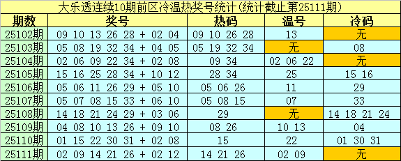 大乐透第25102期-第25111期前区奖号冷温热分布统计: