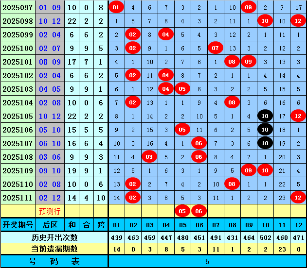 后区分析:上期后区开出一大一小组合:02+12,最近10期后区奖号大小比为9:11,本期预计后区开出全小组合,看好两码05、06。